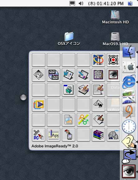 で、次にASMだが、これにはアプリケーションごとにDockの設定を変えるという機能があるので、標準ではDockを隠しておき、Finderに切り替わったときにのみ出現するように設定。更にはClassicウインドウモードという、ウィンドウを1個クリックしたらそのアプリケーションの全てのウィンドウが前面に来るような設定もできるので、これもFinderにのみ適用。これによって、デスクトップをクリックするとFinderウィンドウが全て前に移動して更にDockが現れるという環境を実現。…IEとJEditは雑多に重なり合えたほうが便利だが、Finderウィンドウはさっさと前に来てほしいというオイラのワガママな願望をあっさり可能にしてくれて相当有難いです。