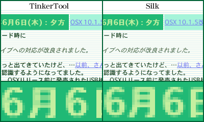 通常の文字は相当拡大してようやく違いが分かる程度なのだが、ボールド体が劇的に違うようで。…そもそも字詰めが変わっちゃってるし。 ……で、どっちがいいかとなると…Silkだけだと小さい文字にはアンチエイリアスが掛からなくなるので、…どっちかというとTinkerToolかなあ。