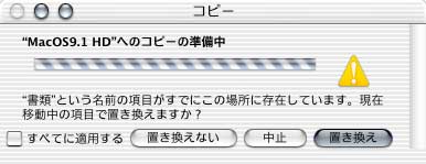 いや、今、作業やってて気付いたんだけど、…OSX10.1の頃は複数ファイルの上書きやろうとすると、上書きファイル1個1個に対していちいち『置き換えますかダイアログ』が出てきて、『置き換え』ボタンを連打する羽目になったりしていたのだが、今回『すべてに適用する』ってチェックが付いている。