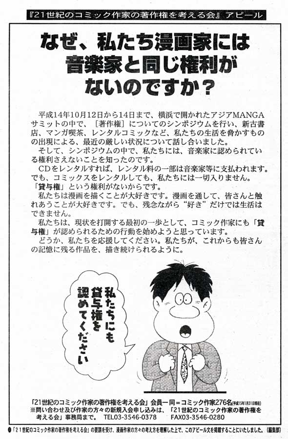 『21世紀のコミック作家の著作権を考える会』が、またまた雑誌に意見広告を載せてきました。