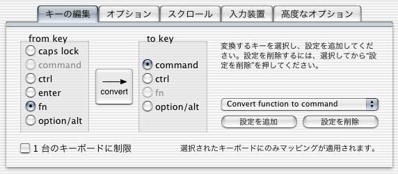 んで、ノートのJISキーボードというのは左側にコマンドキーとオプションキーが無くて、代わりに普段使う事も無いfnキーとenterキーがあってそれが不便だったのだが、これを使ってこのキーをそれぞれコマンドキーとオプションキーに変更してみた。