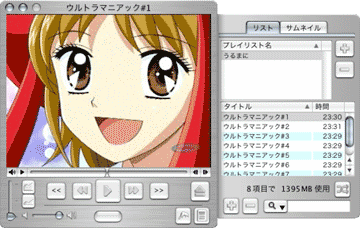 今までに大量に作成したMPEG4を、ビデオ出力経由でテレビに映したりして鑑賞するのがなかなかイイ感じなのだが、…特にテレビに集中するでもなくとりあえず漠然と流したりしたいという時、QuickTimeで1個ずつ開いて流す…というのも煩わしいから、iTunesのような感覚でプレイリストを作ったりして動画ファイルを管理出来るアプリケーションは無いものかと、フリーウェアをいくつか試しているのだが…