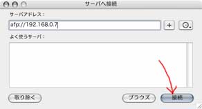 ……なのだが、これを使って接続すると、接続する時のパスワードをキーチェーンに入れる事ができないので、…接続する相手のIPアドレスを調べ、サーバアドレス欄に『afp://192.168.....』って具合に入力して接続ボタンを押す。
