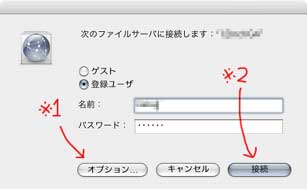 名前とパスワードを入れて繋ぐのだが、…その前に、『接続』を押す前に『オプション…』を押す。