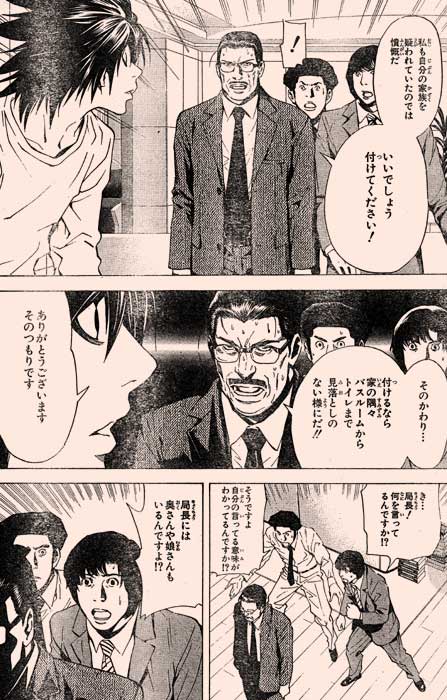 今週のジャンプに載ってたDEATH NOTEだが、… 今まで淡々と話が進んでいたこのマンガだが、今週になって… 殺人犯の嫌疑を家族に掛けられたお父さんがキレて、自分の妻や娘も使っている風呂やトイレに盗聴器とカメラを仕掛ける事を要求!! …むうう、今後の展開がすげえ楽しみだ。