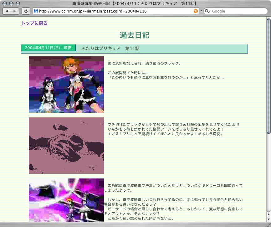 べつにブロードバンドな環境が無いところに行ってる訳でもないのだが、AirH"を頻繁に繋いでいたりする。 トルネードWebを使って色々やってみる為に。 巨重なページをわざわざ選び、画像圧縮を最高にして表示してみたらどんな風に見えるかを試して遊んでたりしてるのだが、…さしあたって、ウチのあのやたら重いページを表示してみた。こつら。(スクリーンショットだとわからないけど、アニメGIFは極限まで減色されてるがちゃんと動く)