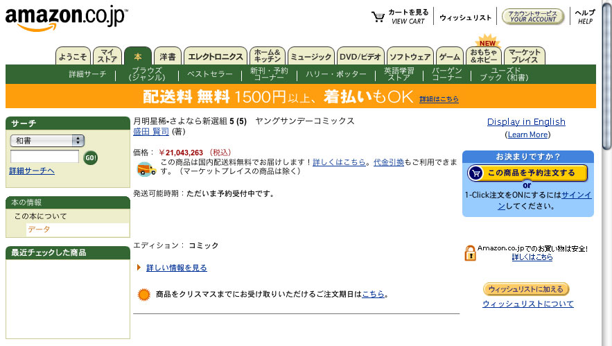 以前、宗子時空にて、アマゾンに登録されている最も高価な書籍の話題が挙がっていたが… その本も252万円という信じ難い価格だったが、今回、それを遥か上回る、2100万円もする書籍がアマゾンに登録された! 月明星稀-さよなら新選組 5 ついでに、記念スクリーンショット。