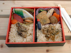 予想外に弁当がちっちゃかったってのと、右の千葉名産(アサリ、ハマグリ、豚、イワシ)よりも、左の仙台名産(カキ、ホタテ、鮭、牛タン)のほうが材料いいねってのが見た目の印象。