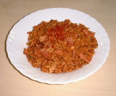 カイエンペッパー一瓶まるまるぶち込んだ甲斐あって、まるでチキンライスのごとく見事な真っ赤に。