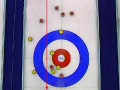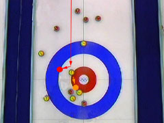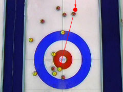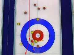 石を回転させて内側にカールさせれば、日本の石の内側に当てる事は可能だが、これだけ大きくカールさせる為には相当弱く投げなければならず、そうすると日本の石に当てた所で、自分の石を赤い円に入れるだけのパワーを出せず、けっきょく駄目。