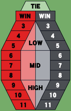 3〜11は、出目そのものの予測をするもので、LOW・MID・HIGHは、出目の大中小のうちどこが出るかを予測するもので、WINは、赤いダイスと黒いダイスで、どっちが大きい目を出すかを予測するもので、TIEは、赤と黒の出目が同じと予測した場合に張る場所。2か12を出してしまった場合は、TIEに張って赤黒どっちも2か12が出た場合以外は親の総取り。