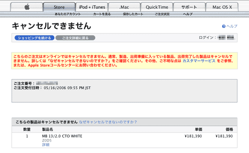 MacBook、なんか、アップルストアだけでなく量販店でも販売開始したらしい… オンライン注文をキャンセルして店頭で買おうにも、もう←こんな状態だしなあ… …まあ、1週間かそこらで入手出来るんだからいいか。初代12インチPowerBookのときなんか、注文から1ヶ月待たされたんだしな。