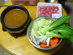 スープカレーの素、水500cc、好みでスパイス適量を鍋に入れて沸かし、そこへ野菜を投入。ある程度煮えたら適宜牛肉をしゃぶしゃぶして野菜と一緒に喰う。