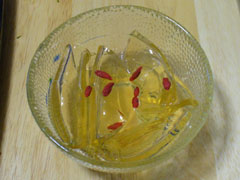 ここに、ガムシロップとレモン汁で作ったレモンシロップを掛け、更にクコをあしらってみた。