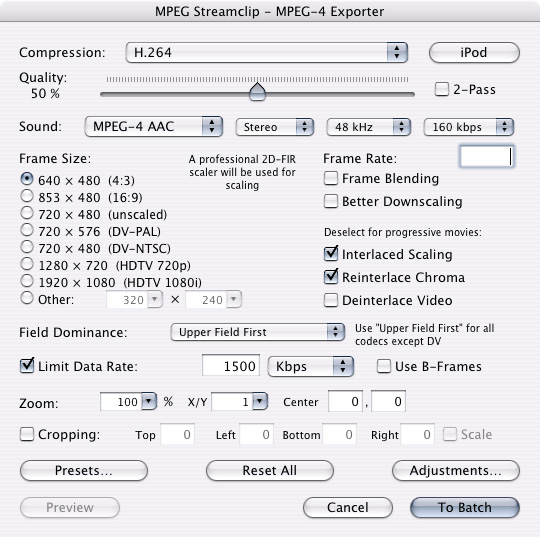 録画MPEG2ファイルからiPod touch用のムービーを作る為のMPEG Streamclipの設定。