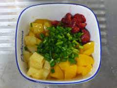 もったりしたあんこには、酸味の効いた果物が合うだろうと、イチゴ、パイナップル、マンゴー、黄桃を使用。