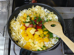 塩、ホワイトペッパー、ガムシロップを少々入れたら混ぜて炒める。