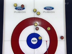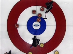 ←ここから中心の黄色イタリアのストーンをはじき出した上に自分のストーンは止めないとならないという難しいショットが要求されたが、見事に成功させ、9-8で初戦を勝利した!