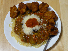 パルメザンチーズの更に上に乗っているマジックスパイスの赤い粉が無ければ、見た目はまるっきり普通のミートソースだ。