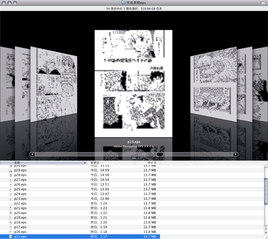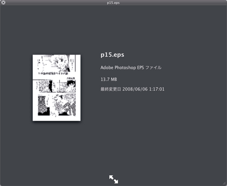 そういえば今回、同人誌のデータ入稿用のファイルの内容を確認するのに、「もしかして、Cover Flow使えばお手軽なんじゃないのか?」と思ったんだが……Photoshop EPS形式のファイル、アイコンプレビューをまんま拡大しただけの画像しか出ない… 「なら仕方ない、Quick Lookで確認してみるか」と思ったら……………やっぱりいちいちPhotoshopで開かないとだめなのかー。