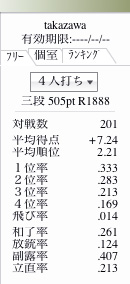 ちまちまとプレイしている天鳳、対局数がついに200を越えたんだが…その成績はこんなカンジになった。 …なんというか、タダでプレイ出来るネット麻雀だと、牌を絞るという考えが皆無な人がすごいいっぱい居て、ロンアガりをすごく期待出来ちゃう麻雀になるのがなあ。 手軽に遊べるネット麻雀だけど、これに慣れちゃうと、しっかり牌を止めてくるピン雀でとかの打ち方に悪影響出るんじゃないかと心配してみたりする今日このごろ。
