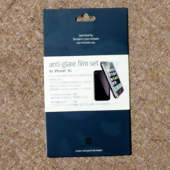 画面への映り込みが激しいのと、指紋跡がやたらと付着するのとで視認性に難があるので、iPod touchにはアンチグレアフィルムを貼っていたんだけど、それのiPhone版、アンチグレアフィルムセット for iPhone 3G PPC-02が出たので買った。 iPhoneの液晶面はそれなりに頑丈だし、べつに画面を保護する必要は無いんだが、これでもう、ビデオ見てるときに画面に映り込む自分の顔を気にしなくていいし、ちょっと弄るたびにいちいち画面を拭いたりする手間がなくなったのはかなりいい。