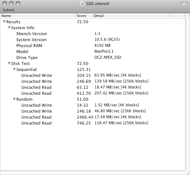 …もっとも、このへんは、Mac Pro(Early 2008)って時点で既にそうとう速いから、SSDによる恩恵は分かりづらいという事か。
