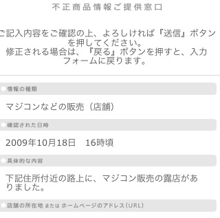 続々成果を挙げてると思しきマジコン通報フォームだが……これ、店舗やネット販売には対応できても、アキバの露店に効果はあるのか?と思って、試しに通報してみた。 アキバのマジコン販売露店を普通に見掛けたので、実際に使う事は無いんだけどいちおうその露店の写真をiPhoneで撮り、店舗の所在地は、その場でiPhoneのマップで取得した住所をコピペして、送ってみた。 …実際にこれが効果あるのかを直接確認する方法は無いんだけど…未だに普通にあるマジコン露店は今後どうなるだろうか。