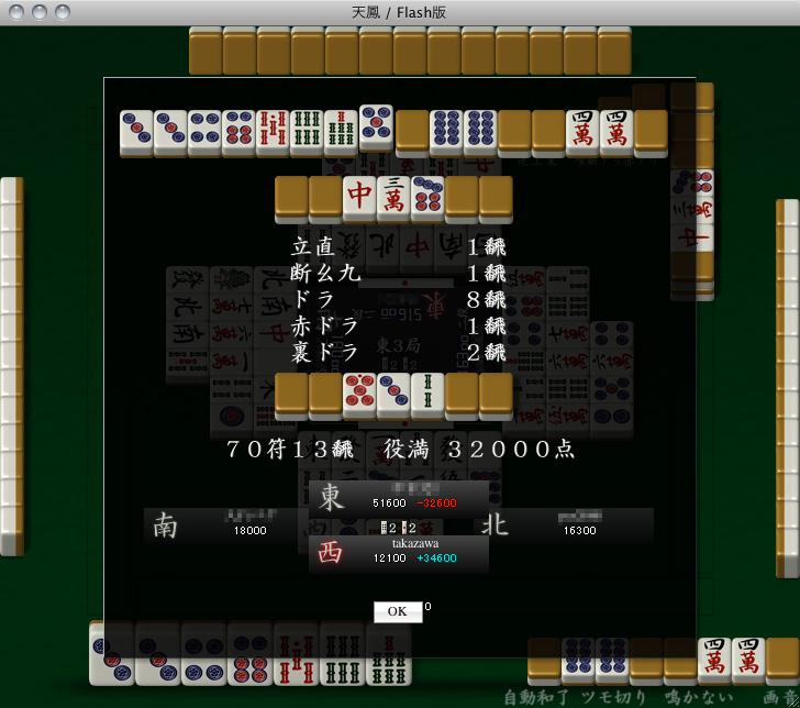 また天鳳で数え役満出した。 対面がぶっちぎりトップなのにリーチ掛けてきて、その後アンカン2つしたら、両方ともモロノリ! そして追っかけたらその対面からアタリ牌がこぼれてロン! 裏ドラ2枚乗ったら役満だけど、しっかり乗った! 脇から出たら2位止まりだったのに、このおかげでラス目から劇的な大逆転トップ!うわーい!