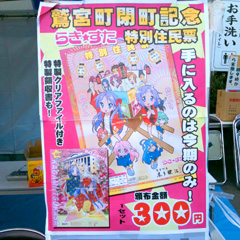 いろいろな商店を見て回った訳だが…ふつうに年期の入った店の前にらき☆すたののぼりやポスターが貼ってあったり、ショーケースにらき☆すたのフィギュアが飾られてたりする光景のミスマッチっぷりが逆に前衛的に感じた。
