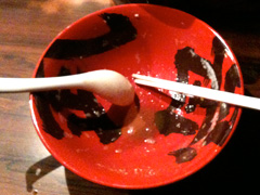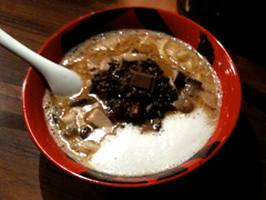 更に、スープを混ぜると、ものすごい勢いでチョコレートの味が広がり、スープはもうチョコレートが隠し味という範囲を超えていて、味噌風味のチョコレートという表現が似合う、糖分と油分いっぱいの、こってり味にも程があるすごいシロモノに!