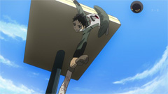 落下していく人を腕一本で受け止めてしまうって演出、このアニメでも出てきた。 …しかし、この演出をやるアニメ全てで共通なのが、こういう風に、人が落ちていくカットの次、 次のカットではもう腕を捕まえていて、落ちていく人に向けて手を伸ばす描写が必ず省略されるのだよね。 …まあ、腕を伸ばしてる間にも相手は落下し続けているんだから、捕まえる事はおろか相手に触れる事すら物理的に無理なんで描きようが無いという理由なんだけど。【参考】GOSICK 第8話『過去の王国に遠吠えがこだまする』