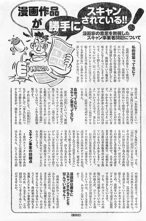 …なんか、ブックオフ叩きの時とまるで同じ事を言ってるな…漫画家の権利と利益を守れとか何とか。