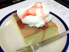 …本来なら生イチゴも乗せたかったが、近所のスーパーでは既にリア充どもに狩り尽くされた後だったんで、イチゴソースで妥協。