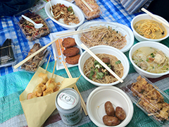 …ただ、汁物とか蓋の無い器に乗せて出される料理とかは、持ち運ぶのがけっこう困難で2品買ったらもう両手が塞がってアウトとかよくあるので、底面積が広い紙袋を持参して、そこに買った料理を入れて運搬するととてもべんり。あと、勿論レジャーシートも忘れないように!