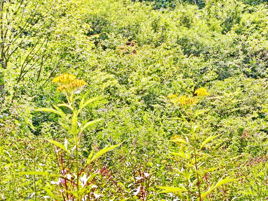 ジャガラモガラという奇妙な名前で呼ばれるこの土地は、山形県天童市東部の雨呼山中腹にあり、標高540m、東西90m、南北250m、深さ100mのすりばちの様な地形をしています。 この地形に特徴があり、地下構造の関係から水がたまらず、所々に風穴(ふうけつ)と呼ばれる”穴”があり真夏でも10℃以下の冷たい空気が吹き出しています。 更に、その冷たい空気の影響で、くぼ地の底は温度が上がらず、比較的高山に多く見られる植物が生えている。 くぼ地の上に行くに連れ、植物の背丈が高くなるという植物の垂直分布が、普通の高山と逆になっています。 春は遅く、秋が早いことから、7月〜8月にかけて四季の花々が一斉に開花するそうです。