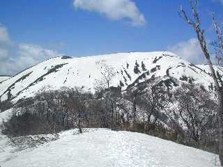 時間も遅いので先を急ぐ。しばらくは緩やかな雪原の下りである。周囲は開けていて、山頂部がどんどん近づいてくる。一面の雪となるとさすがに風も冷たく、またここから先は時々強風に煽られるようになり、さすがに上着を着た。緩やかな下りが一段落し、少し急になると、尾根は細くなり土の道になる。鞍部に着くと、今度は山頂を見上げる形になり、なかなか雄大である。