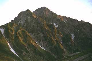 立山・剣岳 夏休みの最後に、今年の目標として計画していた。立山・剱を歩いてきました。ルートは一般ルートですが、北アルプスのいいところを思う存分楽しめたと思います。今回は、会社の同僚2人に同行いただきました。 コース概略は、「室堂〜一の越〜立山縦走〜剣沢小屋〜別山尾根〜剱岳〜剣山荘〜剱沢〜真砂沢ロッジ〜ハシゴ谷乗越〜内蔵助平〜黒四ダム」です。 【日 程】96年8月24日(土)〜96年8月26日(月) 【目 的】立山・剱岳 【天 候】24日 曇・霧 25日 晴のち曇り 26日 曇り時々雨 【コース】1日目 室堂より立山を縦走し剣沢小屋へ 0940 室堂→ 1027/1040 一の越→ 1125/1215 雄山→ 1230/1300 大汝山 → 1335/1345 真砂岳 → 1425/1440 別山 → 1515 剣沢小屋 2日目 剱岳を往復し剱沢を下って真砂沢ロッジへ 0530 剣沢小屋 → 0550/0605 剣山荘 → 0620/0630 一服剱 → 0710/0720 前剱 → 0900/1000 剱岳 → 1125/1147 前剱 → 1220一服剱 → 1240/1340 剣山荘 → 1500 真砂沢ロッジ 3日目 真砂沢ロッジから内蔵助平を経て黒四ダムへ 0645 真砂沢ロッジ → 0815/0820 ハシゴ谷乗越 → 0932 内蔵助カール分岐 → 1100/1140 1ルンゼの押出 → 1155 内蔵助谷出合 → 1240/1330 黒四ダム直下 → 1400 黒四ダム 【山 名】雄山 3003m 大汝山 3015m 真砂岳 2861m 別山 2874m 一服剱 2618m 前剱 2813m 剱岳 2998m 【メンバー 】会社の同僚 TさんとYさん と私の3人 【山 域】北アルプス 【参考書】フルカラー特選ガイド 立山・剱岳を歩く(山と渓谷社) 昭文社エアリアマップ 剱・立山 メンバー紹介 Tさん 剱岳のルートは一般的な 尾根・岩稜・雪渓 はすべて歩いた、某大学WV部OB。 年は私と同じ。今回のリーダー。 Yさん 比良・鈴鹿等を歩く。3000m級は今回が2回目。年は..若い 1日目 1.登山口まで(千葉〜扇沢) 金曜日の夕方7時に千葉を出発し高速に乗ると、いきなり篠崎まで渋滞。それを抜けたと思ったら、小松川〜代々木まで渋滞。結局高井戸までのろのろ運転である。これこそ殺人的な渋滞という。扇沢の駐車場には翌朝1時過ぎに着き仮眠する。四日市から扇沢に向かった両氏は駐車場でテントを張っているはずであるが発見できず。翌朝駅構内で発見、雨が降りそうなので駅の中でテントを張っていたとのことだった。 2.アルペンルートで室堂へ 始発のトロリーバスにのり、いろいろ乗り継いで室堂へ。10キロ超の荷物は別料金をとられるが、3人とも13キロ前後。もう少しまとめれば、一人だけ払えばよかったのに....アルペンルートであがる時は、水等よけいなものは抜いて、9.9キロに押さえましょう(^^)。扇沢7:30の始発でスタートしたものの、スムーズに始発が接続しているわけではなく、乗り継ぎの度に待ちがあり、室堂には9:25着。途中黒部平(ロープウェイの乗車駅)からまわりを展望するが、高いところは霧の中。かろうじて後立山連峰の一部が見渡せる。最後のトンネルバスは、今年からトロリーバスになったようだ。 3.立山縦走 室堂に来るのは実に17年ぶりだ。だがその時の風景とはほとんど変わりがないあるとすれば、当時の晴天と今日の曇天、当時の紅葉と今日の緑と雪渓。あとは記憶のかなたの室堂と同じである。今日は雄山・大汝山等高い部分は雲の中に隠れてしまっている。今回はあくまでも剱岳がメインで立山はおまけ的行程なので、本当の素晴らしい立山をまた味わいにくるとして、今日はしっかり歩くことを楽しもうと思う。 準備を整えて出発。一の越までは緩やかに遊歩道のような道を空身の観光客と団子になって登っていく。途中雪渓を何回か横断する。まだまだ消えない。雄山へもたくさんの観光客と一緒である。これも抜きつ抜かれつの登りである。同行の両氏はどんどん先に行ってしまうが、足の遅い私はだいぶ遅れて雄山着。標高差は400m程度の結構きつい登りなのだ。雄山は人でごった返しており、居場所がないほどだ。せっかくきたので山頂に登る列に並ぶ。400円の拝観料を払い、狭い雄山の頂上部に通されて祈祷をうける。健康と登山の安全祈願である。おみくじ100円で合計500円の山頂だった。 一人、下で待っていたTさんと合流し、大汝山へ。立山の最高峰である。岩礫の頂上であるが、展望は霧の為皆無である。晴れていれば、北アルプスのほとんどすべての山が望まれる展望の峰のはずだ。ここでゆっくり休憩する。 大汝山からは、富士の折立のピークは巻いて過ぎ、真砂岳に向かう。鞍部には内蔵助カールの壮大な風景が広がる。2000年前の雪渓が残るこのカールは形がよく実に雄大な眺めだ。真砂岳は平坦な頂上でどこが山頂なのかよくわからないまま、室堂側から吹き付ける雲が霧雨になって寒さを感じてきたので、早々に通過する。ただ、のびやかな稜線は雰囲気のいい山には間違いない。 別山への鞍部に下って登り返す。靴紐をなおしている間にまた2人は先行してしまったので、のんびり霧の中を歩く。別山直下は、霧がでると方向が非常にわかりにくくなる。途中でよく方向がわからなくなってきたので、霧の中かすかにチラチラする高みをめざし