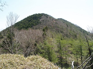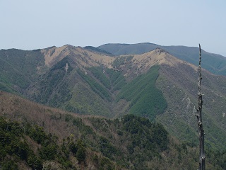 岩稜を辿ると大常木山の山頂で、久しぶりの「KUMO」氏の山名標を見ました。マイナーなピークに時々現れる山名標で、拘りがあるようで、見ると嬉しくなります。そしてこの岩の上の頂上は、北に開けていて正面に和名倉山を眺める絶好の展望台になっています。東仙波とその向こうの和名倉山は立派でどっしりとしていて、明日はあれに登るかも知れないと思いながらも、ちょっと圧倒される気分でした。大常木山の山頂の展望はそれほど期待していなかっただけに、大収穫でした。