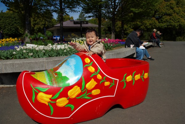 渓流広場の横には、オランダ製という大きな木靴が置いてあったので、とりあえず創太を入れてみたところ………喜んでました。