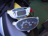 で、いよいよメーター本体の取り付け。取り外したパネルからノーマルを外して、そこにはめ込むだけ。後はカプラーを同じ形のを差すだけなので至ってカンタン。ただ、ライト側のパネルの取り付けはかなり苦労する。フロントパネルの裏側のパネルのハンドルの根元の部分が残るからやりにくいんだよねぇ。