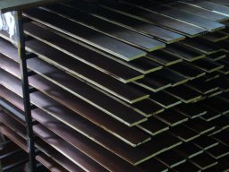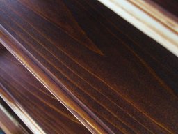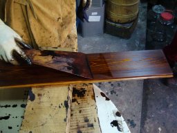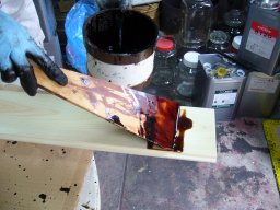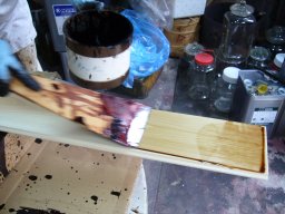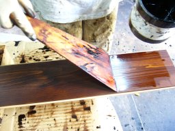 上の写真の材の約3時間後の様子です。硬化にしたがい漆の色は驚くほど変わっていきます。 |
