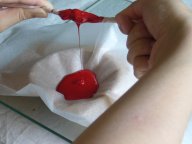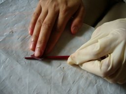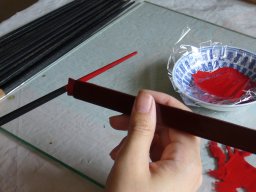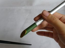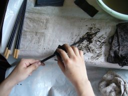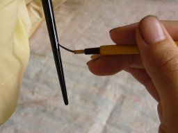 | 塗っている最中にホコリが乗ってしまったら、鳥の羽の軸の先を尖らせたものでそっと取り除きます |