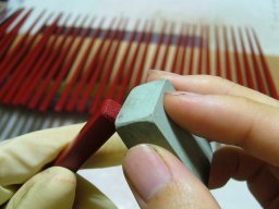 一本ずつ先端を丸めます。意外と全体の印象に影響するので、気を遣います。同時に木地に反りがないかチェック。 |